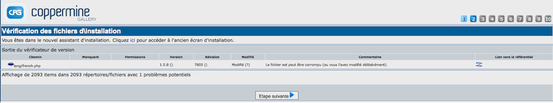 A la seconde étape de l'installation, une vérification est faite pour voir si le pack que vous voullez installer est le plus récent. Ceci est fait afin de vous assurez que vous êtes bien en train d'installer la dernière version de Coppermine, dans laquelle tous les bugs connus sont corrigés. Généralement, si vous venez juste de télécharger les fichiers depuis le site officiel de Coppermine sur sourceforge.net, tout va bien. Si l'installateur vous indique que vous n'avez pas la dernière version, vous devriez télécharger celle-ci avant de continuer. La seule exeption à cette règle est si vous n'utilisez pas un pack officiel (téléchargé depuis lea section officielle de téléchargement de Coppermine), mais une version issue de subversion: Le compteur de version/révision n'est pas tenu à jour entre les publications, donc si vous utilisez une version issue du référentiel SVN, il est normal de voir qu'il y a des fichiers qui s'affichent comme obsolètes. Si vous n'avez aucune idée de ce qu'est le référentiel SVN, cette exeption ne s'applique évidemment pas à vous.