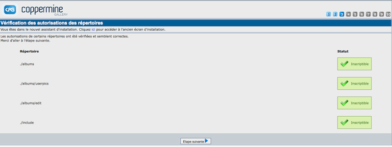 Coppermine doit avoir les droits en écriture dans certains sous-répertoires comme expliqué dans Paramètres des permissions. L'installateur ne peut pas définir ces droits pour vous, vous devez le faire vous même auparavant. Si vous l'avez fait correctement, tous les répertoires vérifiés par l'assistant d'installation devraient être marqués "OK". Si ce n'est pas le cas pour vous (si l'installateur vous signale des manques pour un ou plusieurs répertoires), laissez l'écran du navigateur comme il est et allez paramétrer les droits correctement. Une fois fait, revenez à l'écran d'installation et rafraichissez la page pour voir si le problème des droits est résolu.Vous ne pouvez cliquez sur le bouton Suivant si les autorisations nécessaires sont définies.