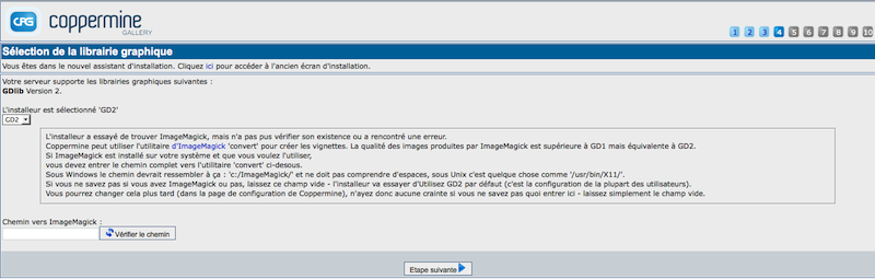 Coppermine à besoin d'une librairie graphique présente sur le serveur (voir minimum requis → librairie graphique). Actuellement, GD et ImageMagick sont supportés. A cette étape de l'assistant d'installation, plusieurs vérifications sont faites pour définir quelle librairie graphique est disponible sur votre serveur. Généralement, vous pouvez aller à l'étape suivant s’il n'y a qu'une librairie graphique trouvée. Si l'installeur indique qu'il ne trouve pas de librairie graphique, vous devrez manuellement la définir. Vous ne pouvez pas passer cette étape, Coppermine n'installera pas de librairie graphique pour vous - c'est une partie des minimum requis. Si vous n'avez pas l’une des librairies graphiques supportées par Coppermine, vous ne pourrez pas utiliser le script.