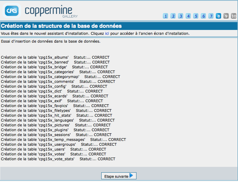 L'écran de structure de la base de données n'est là que pour votre information - vous ne pourrez agir sur rien ici. L'écran montre la progression des opérations réalisées pour créer les tables de la base de données de votre galerie. Si tout se passe bien, vous verrez une série de lignes avec des messages du type Création de la table 'XXX' Statut:... CORRECT. Si vous n'avez pas le statut "CORRECT" à chaque ligne, quelque chose ne s'est pas bien passé et il faudra vérifier. C'est généralement le cas si le compte de la base de données MySQL que vous avez défini à l'étape "Authentification de l'utilisateur MySQL" n'a pas les privilèges nécessaires à la création de tables. Une autre raison d'erreur peut provenir d'un manque de place dans la base de données. Dans les deux cas, vous devrez contacter votre hébergeur pour avoir de l'aide.