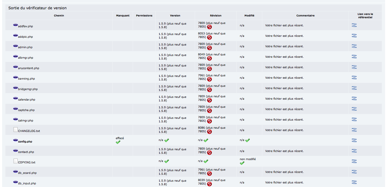 Le script passe en revue les fichiers de votre serveur web et essaye de vérifier si la version de votre fichier local sur votre serveur est la même que celle du référentiel de http://coppermine-gallery.net. Les fichiers qui ne sont pas identiques sont affichés et sont les fichiers que vous devriez mettre à jour.